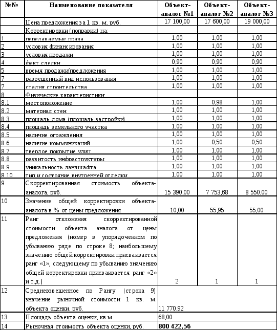 известными ценами, затем цены аналогов подвергались корректировки с учетом