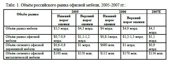В 2005-2006 гг. согласно разным источникам доля офисной мебели в общем объёме рынка мебели варьировалась от 20% до 28%. Например, по данным Центра развития мебельной промышленности, доля офисной и специальной мебели в общем объёме мебельного рынка России в 2005 г. составила 25%. В 2006 г. доля офисной мебели в общем объёме рынка мебели равнялась 20%, а в 2007 г. доля составит ориентировочно 24%.