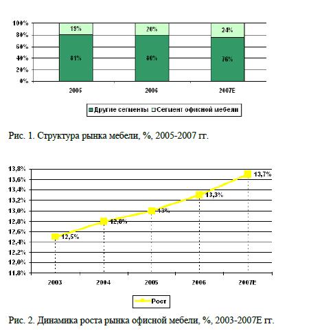 В 2005-2006 гг. Доля общего объёма офисной мебели в общем объёме рынка мебели значительно не менялась. В 2007 г. прогнозируется 20-24%.
