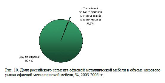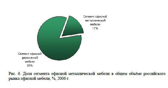 В 2006 г. доля сегмента офисной металлической мебели в объёме российского рынка офисной мебели составила 17% по сравнению с 2005 г.-в 14%. Объём сегмента офисной металлической мебели в 2006 г. по пессимистичным оценкам экспертов составил $113 млн. по сравнению с аналогичным показателем 2005 г. ($100 млн.), по оптимистичной оценке - $170 млн. (учитывая розничные цены, в которых присутствует наценка 30-40%) (2005 г. - $150 млн.). Рост в 2006 г. составил чуть больше 13%. Прогнозируемый объём в 2007 г. $113 млн.