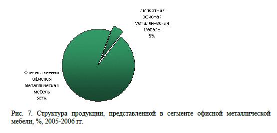 По оценкам экспертов, доля импортной офисной металлической мебели в 2005-2006 гг. составила 5%. Для сравнения - в 1995-1996 гг. в сегменте офисной металлической мебели преобладала продукция иностранного производства.