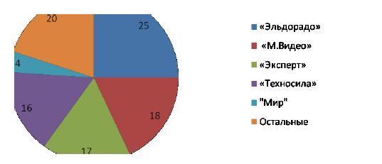 По данным на 2009 год, 75% рынка приходилось на 4 компании - «Эльдорадо», «М-Видео», «Эксперт», «Техносила» (рисунок 2). В 2010 году на долю пяти крупнейших сетей приходится около 70% рынка: эту долю занимают «Эльдорадо», «М.Видео», «Эксперт», «Техносила», «ДОМО». Среди иностранных компаний можно выделить: Media Markt и Miele. В конце 2007 года у «Эльдорадо» было 842 магазина (включая франшизу), выручка достигла $4,6 млрд. «М.Видео» занимала вторую строчку (112 магазинов, $2,1 млрд), «Техносила» — третью (105 магазинов, $1,5 млрд), а «Мир» — четвертую (66 магазинов, $0,7 млрд). Media Markt открыла к этому времени 11 гипермаркетов с выручкой около $0,3 млрд. В кризис торговля бытовой техникой оказалась среди лидеров падения. Участники рынка заявляют, что предвидели такой вариант развития событий еще осенью 2008 года, однако воспользоваться кризисом для усиления своих позиций смогли немногие (по материалам http://www.reportal.ru/researches/index.php?id=6764&h=reportal.ru&parent=getdemo&child=getresearch_new и http://www.forbes.ru/ekonomika/rynki/57784-za-peredelom-rynka-stoit-pokupatel ).