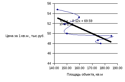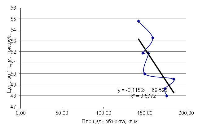 Рис.3. Линейная зависимость между площадью и стоимость 1